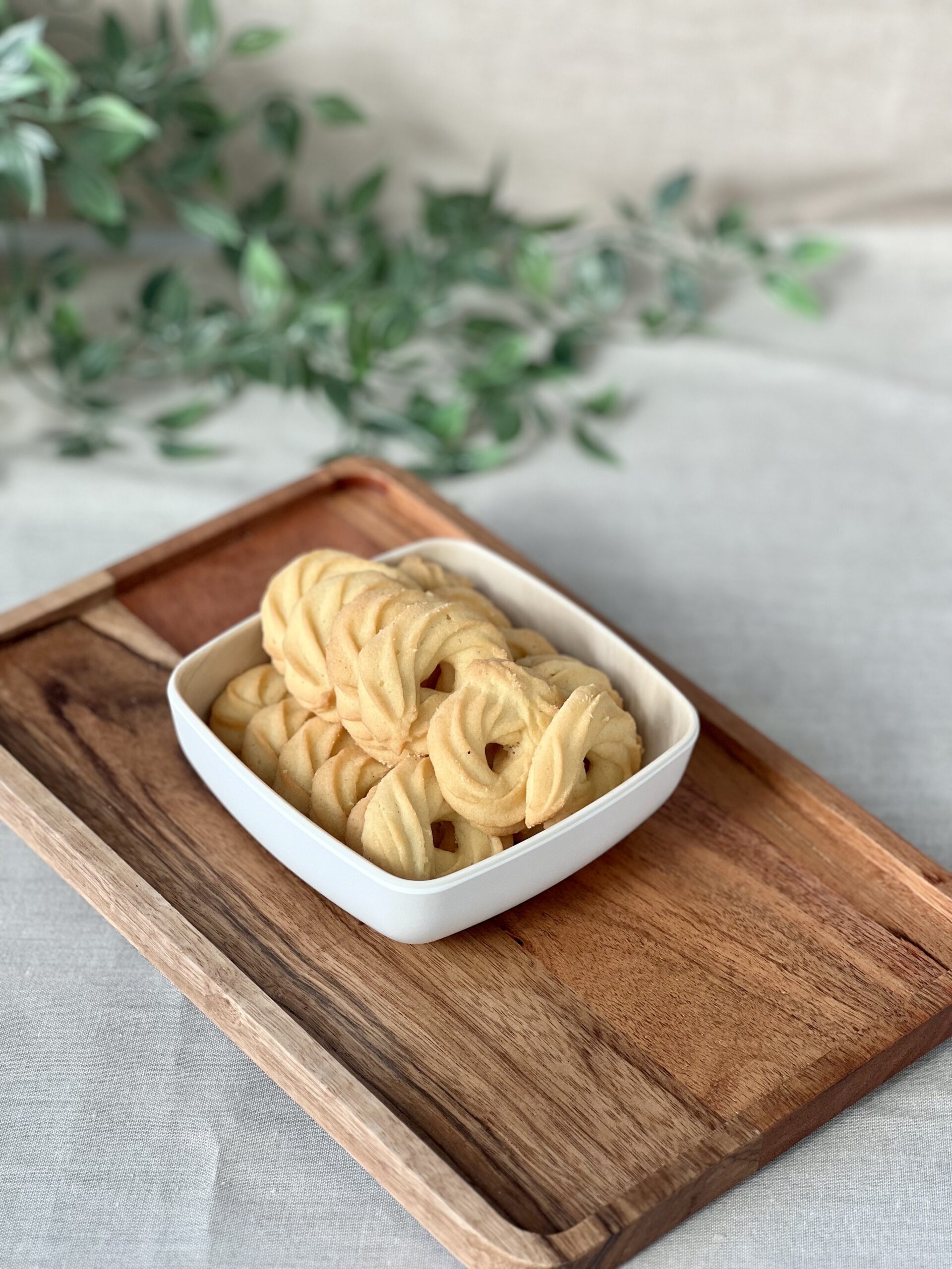 Vehnäjauho, tomusokeri, kananmuna, vaniljasokeri, laktoositon voi, happamuudensäätöaine (E330), aromi, väri E160a, vitamiina A)